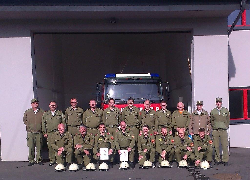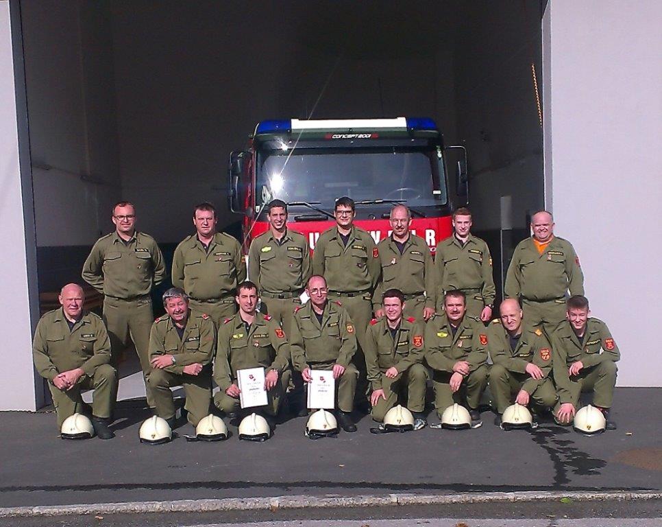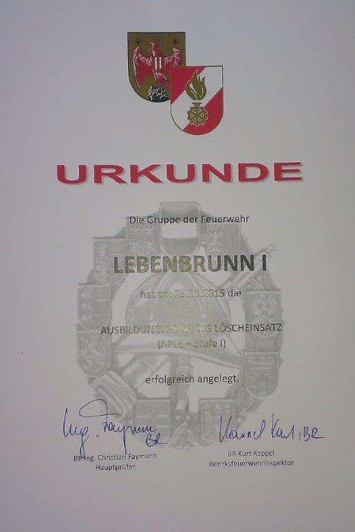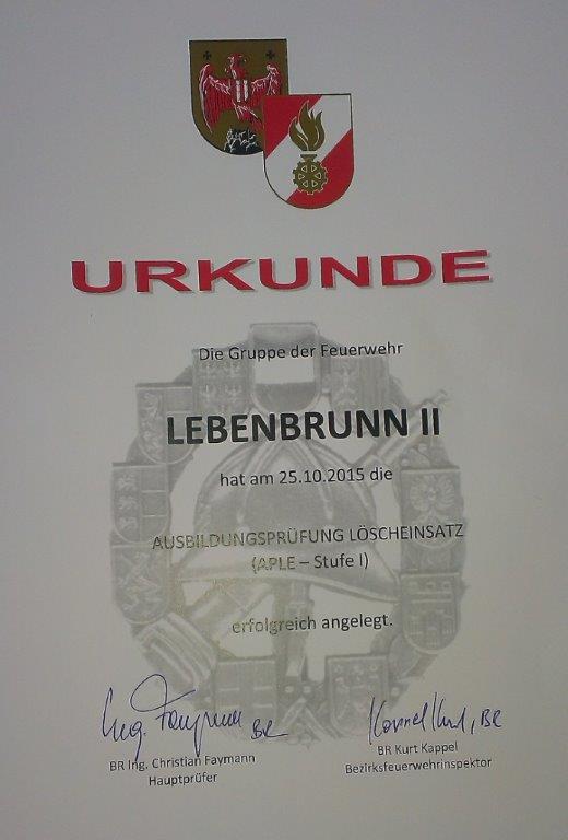 15 Mann der Ortsfeuerwehr Lebenbrunn absolvierten am 25. Oktober 2015 erfolgreich die Ausbildungsprüfung-Löscheinsatz (APLE), Stufe 1, Variante 4.