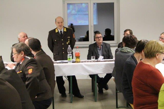 ABI Weber begrüßt die erschienen Personen. Auf Abschnittsebene verlief 2015, mit Ausnahme der Unwettereinsätze rund um Pfingsten, eher ruhig. Lediglich die Stützpunktwehr war im Bereich der technischen Einsätze (Personenrettung) mehr gefordert.
