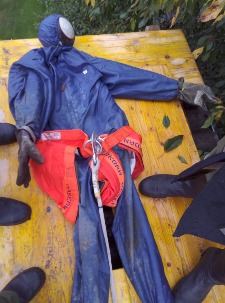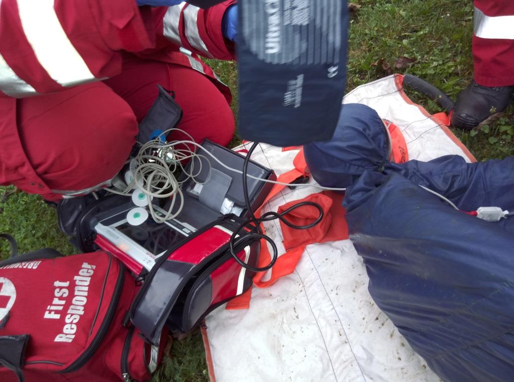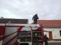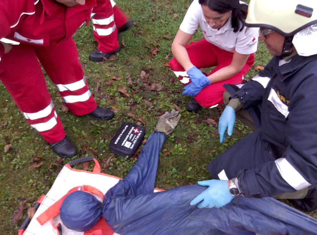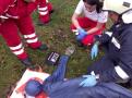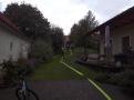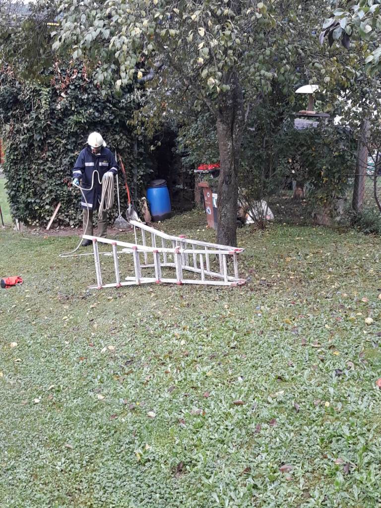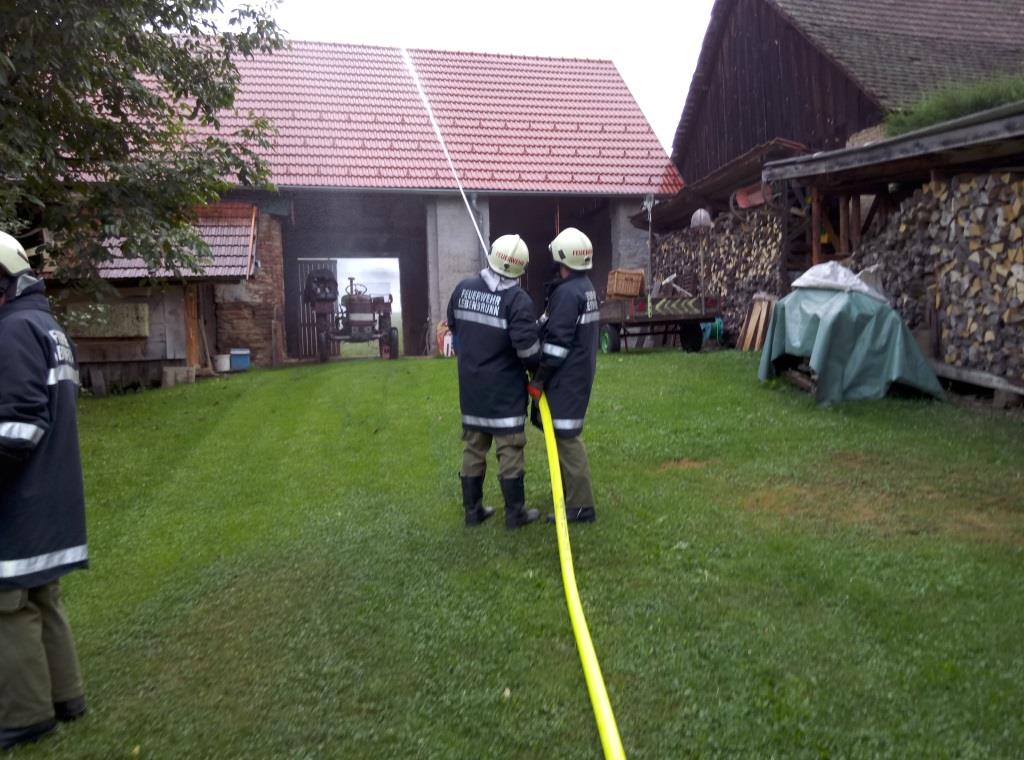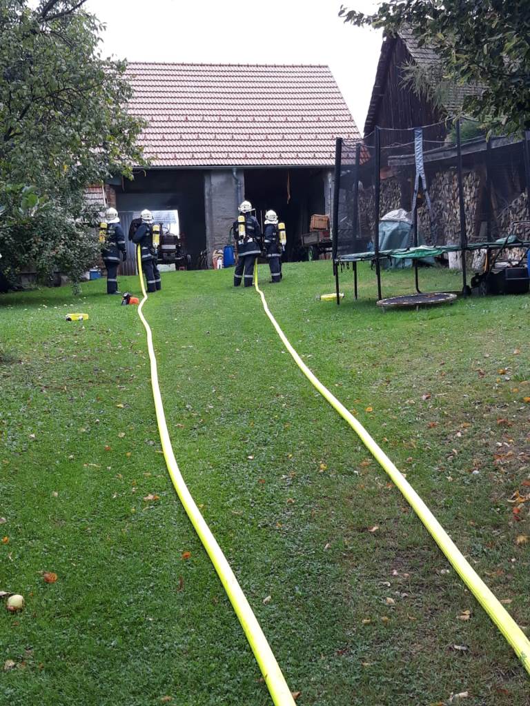Während sich der ATS-Trupp ausrüstete bzw. sich zum ATS-Sammelplatz begab, wurde von der restlichen Mannschaft die B-Zubringerleitung aufgebaut. Diese wurde durch einen Hof in der Oberen Gasse Richtung Brandobjekt verlegt. Nach Fertigstellung wurde sofort mit dem C-Außenangriff gestartet. Während der Brandbekämpfung wurde durch unseren Zugskommandanten BM Schlögl festgestellt, dass am Dach eines Nebengebäudes eine bewusstlose Person liegt. Fünf Mann begannen unverzüglich mit der Bergung. Die verletzte Person wurde mittels Dreieck-Sitztuch über eine Leiter abseilt und „erstversorgt“, anschl. auf das Bergetuch umgelagert und dem Roten Kreuz, zur weiteren medizinischen Versorgung, übergeben.