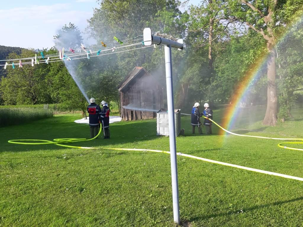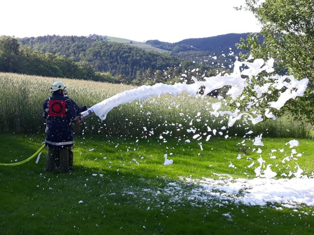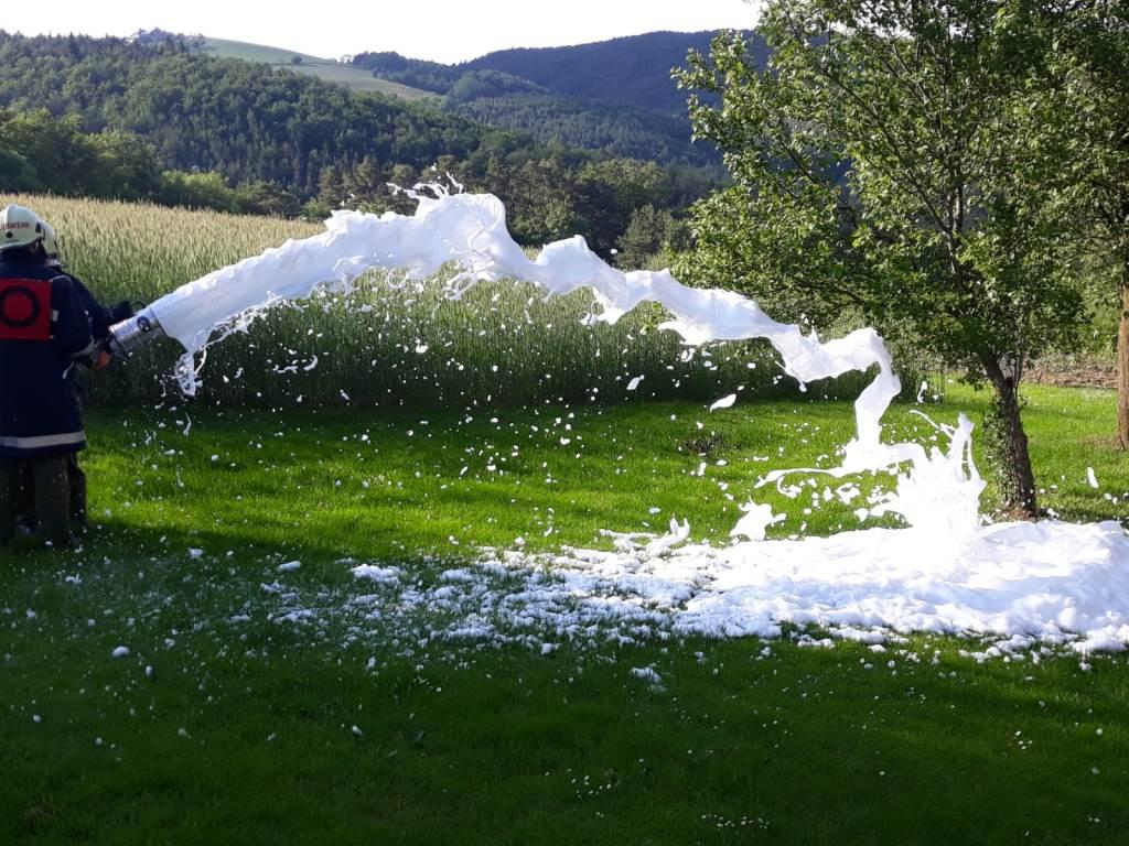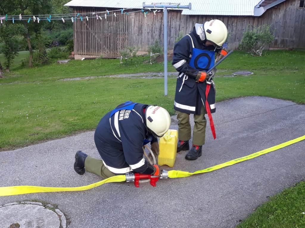 Nachdem der Bereich „Fragen und Gerätekunde“ (jeweils eine Frage bzw. ein Gerät) fehlerfrei erledigt wurden, zog Gruppenkommandant Schlögl den Flüssigkeitsbrand als Löschangriffsvariante. Bei diesem Löschangriff muss der Brand mittels Schaum gelöscht werden. Die Gruppe erledigte diese Aufgabe innerhalb der vorgegebenen Sollzeit. Das Prüferteam vergab jedoch 4 Fehlerpunkte. Dies wirkte sich nicht negativ aus und die Gruppe bestand die Branddienstleistungsprüfung der Stufe I. Da aus der Gruppe bereits 6 Kameraden 2015 die Ausbildungsprüfung Löscheinsatz (APLE) abgelegt hatten freuen wir uns mit