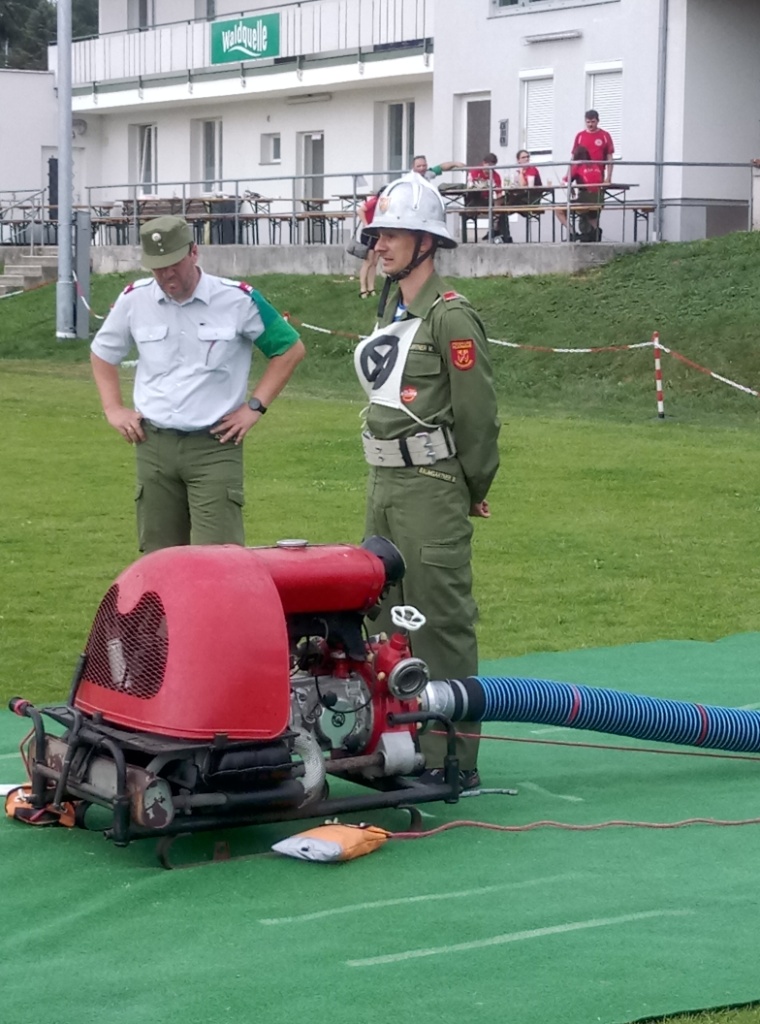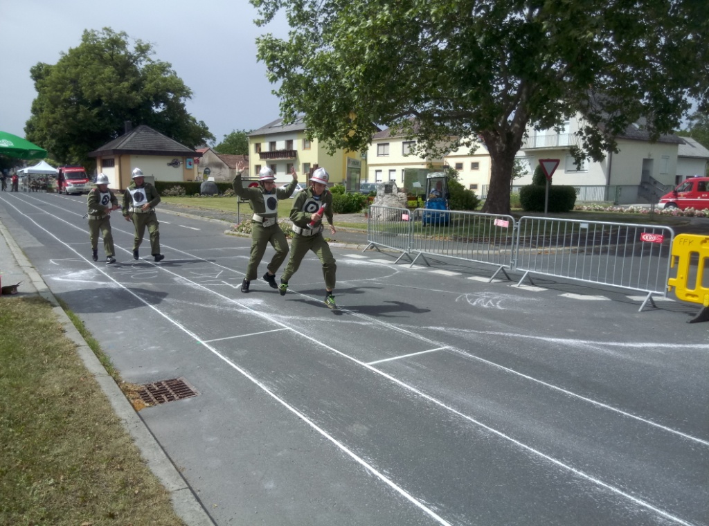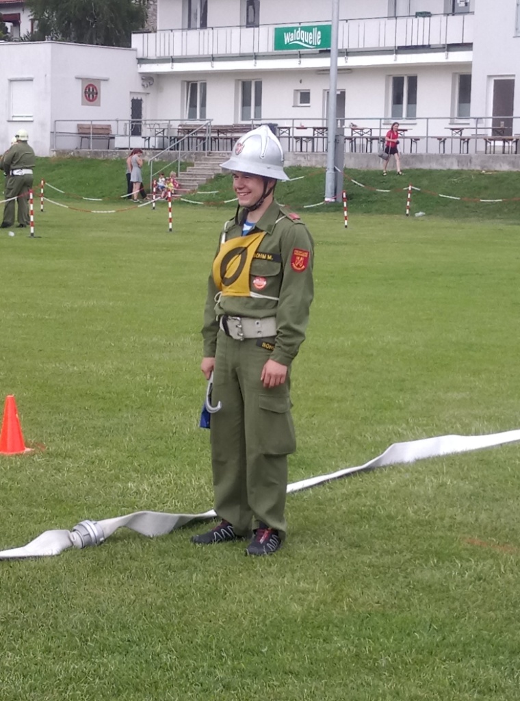 Bei mehr als 30°C stellte sich unsere Wettkampfgruppe den kritischen Augen der Bewerter. Im Bewerb Bronze A (Positionen sind fix zugeordnet) lief alles relativ rund. Unser Schlauchtruppführer stoppte die Löschangriffszeit bei ca. 36 sec. Das Bewerterteam war jedoch der Ansicht, dass der Löschangriff erst nach 38 sec. beendet wurde und vergab somit 10 Fehlerpunkte. Die Staffellaufzeit betrug 57,94 sec. Mit einer Gesamtpunktezahl von 394,06 bedeutete dies den 3. Endrang.