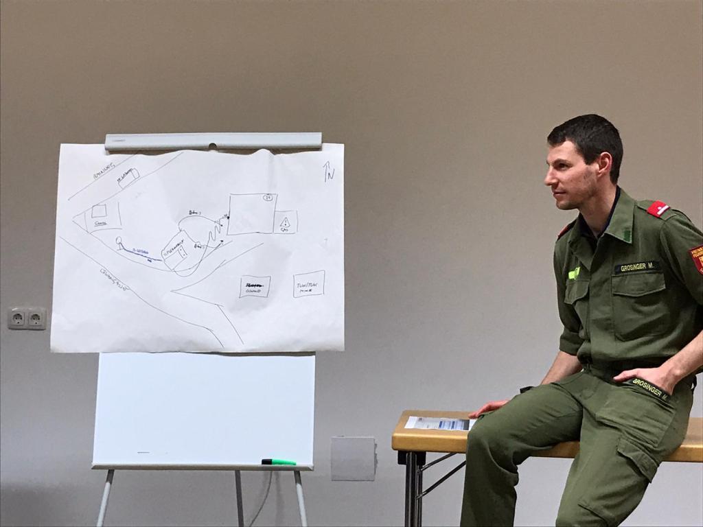 Im Anschluss (Teil 2) wurde dieses erworbene Wissen in die Praxis umgesetzt. Als Beispiel wurde ein Wohnhausbrand in der Löwengasse mit 2 vermissten Personen herangezogen. Die anwesenden Mitglieder erarbeiteten in 2 Arbeitsgruppen entsprechende Lösungsansätze für diesen Einsatz und präsentierten abschließend ihre Ergebnisse. Im Zuge der Ergebnispräsentation stellte sich heraus, dass die beiden Gruppen das vorgegebene Szenario unterschiedlich analysierten und abbildeten. Unterm Strich wurde diese Einsatzsituation auf gleiche Art und Weise gelöst.