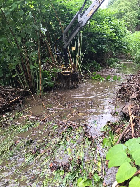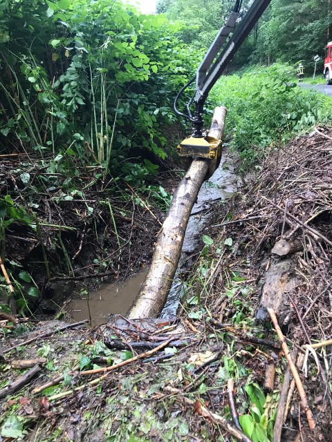 Vor Ort stellte sich heraus, dass die Mittel der Feuerwehr (div. Schanzwerkzeug) nicht ausreichend sind und hier schweres Gerät von Nöten ist. Die Einsatzstelle wurde abgesichert und zwecks Beseitigung der Verklausung ein Rückewagen organisiert.