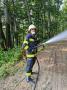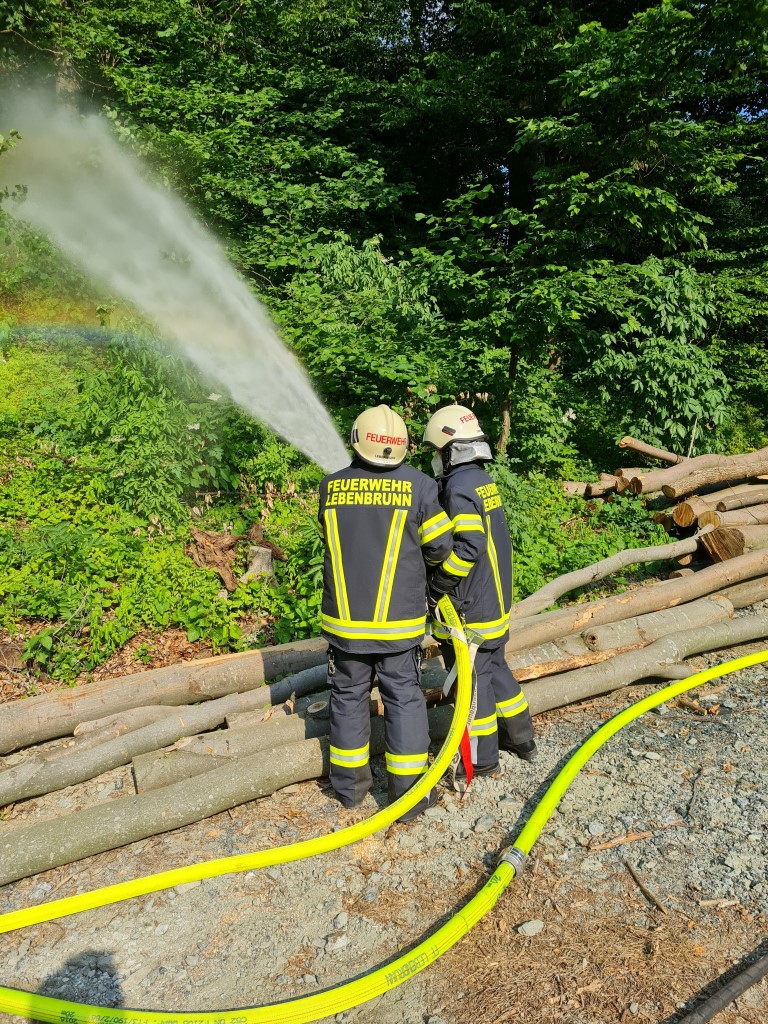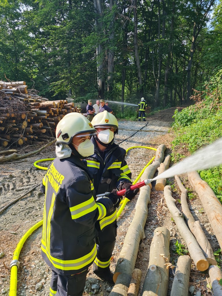 Im Anschluss daran wurde die Brandeinsatzübung durchgeführt. Annahme war ein Brand im Urbarialwald. Unter dem Kommando von Einsatzleiter Kdt.-Stv. Andreas Schlögl rückte die Mannschaft mit dem TLF-A, MTF und TSA aus. Der Erstangriff wurde mit dem HD-Rohr durchgeführt. Nachdem die B-Zubringerleitung vom Bassin am Dorfplatz zum TLF-A hergestellt war, wurden weitere Löschangriffe mit C-Rohren durchgeführt.