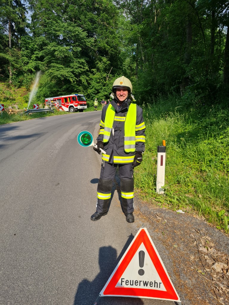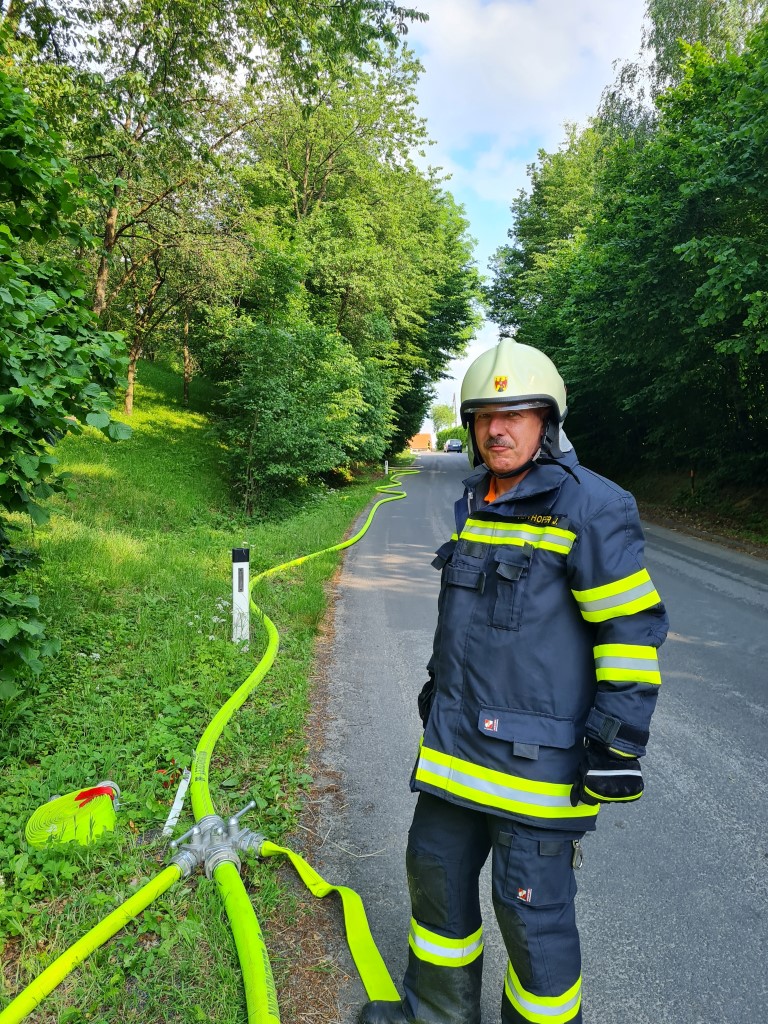 Ebenfalls zufrieden zeigte sich ABI Weber mit der Übung und bekundete ein selbstsicheres Auftreten der Mannschaft. Kdt. Stefan Weber merkte an, dass vor allem die Zubringerleitung gut verlegt wurde (neben Landesstraße) und die Absicherung der Einsatzstelle ordnungsgemäß erfolgte.