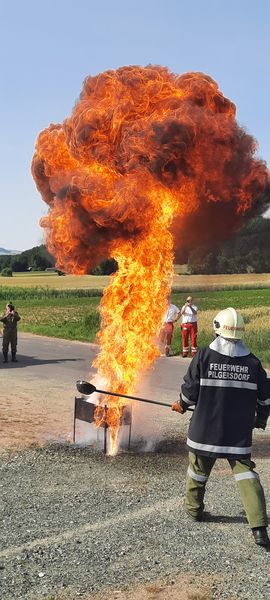 Nachdem die Brandeinsatzübung beendet war wurde den Kindern unter anderem noch vorgeführt was passiert, wenn ein Fettbrand mit Wasser gelöscht wird. Mitfahren mit den Einsatzfahrzeugen und Löschen mit dem Strahlrohr bildeten den Abschluss einer gelungen Übung.