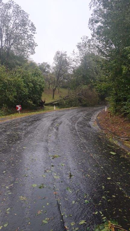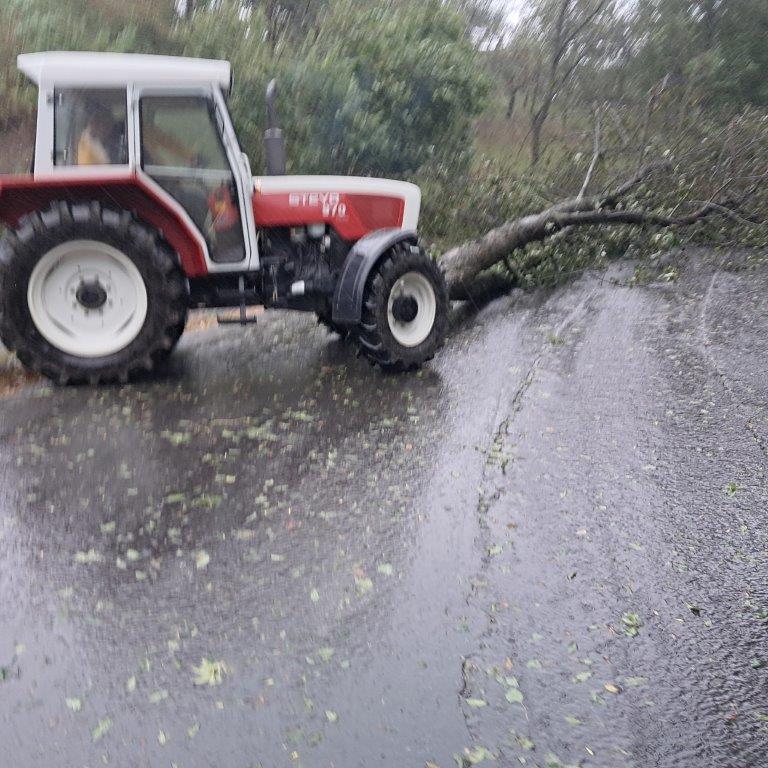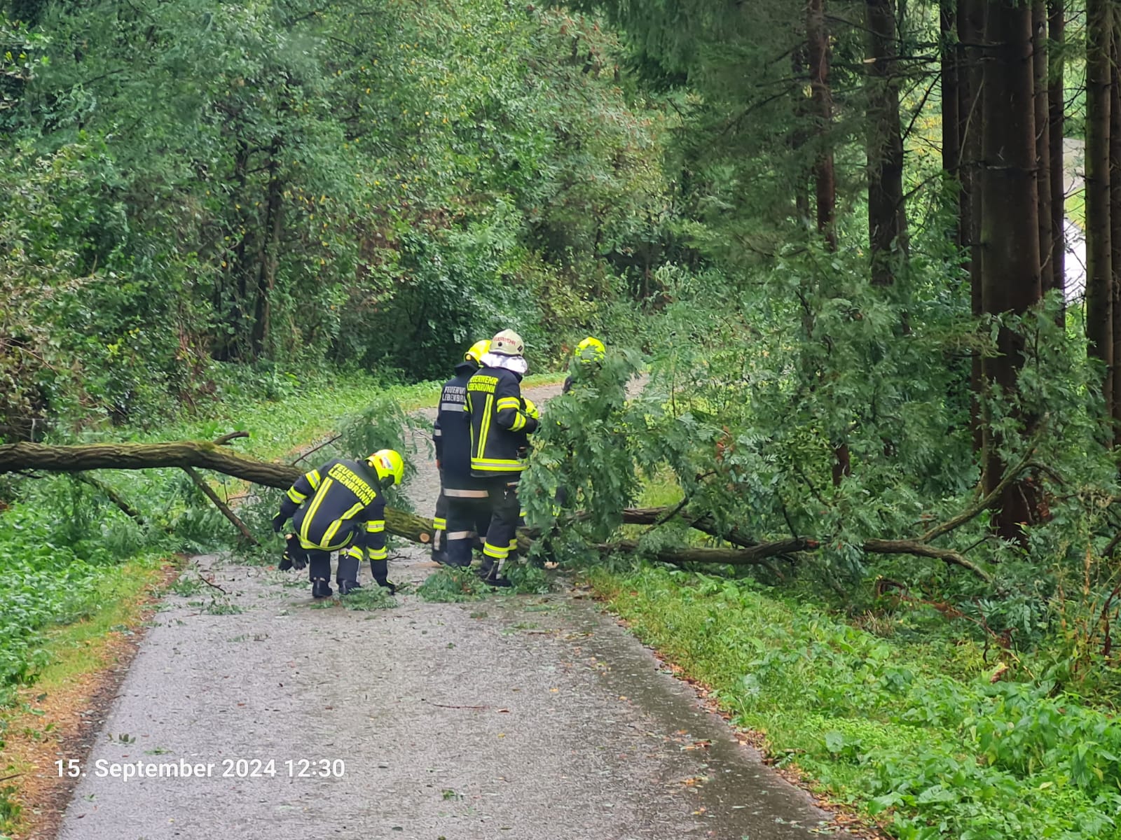 Um ca. 12:30 Uhr wurde die Feuerwehr neuerlich (diesmal mit ALSON X) alarmiert. 2 umgestürzte Bäume blockierten den Güterweg Richtung Pilgersdorf (Höhe Quelle). 9 Mann rückten mit dem TLF-A aus, zerkleinerten den Baum und reinigten grob die Fahrbahn. Gegen 13:15 Uhr war die Einsatzbereitschaft wieder hergestellt.