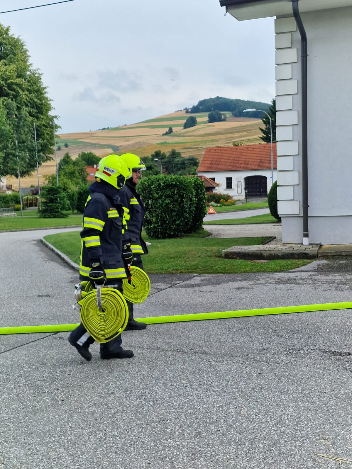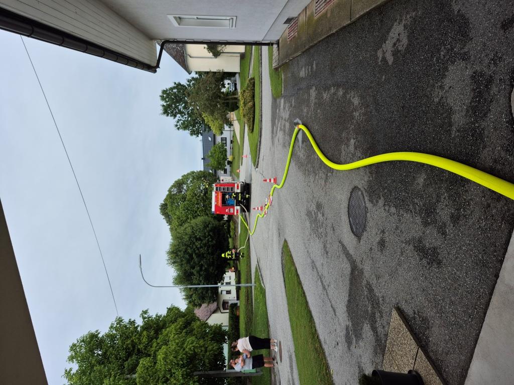 „Brand eines Wirtschaftsgebäudes - Dorfplatz 8“, so lautete die Annahme für ein Brandeinsatzübung am 26. Juli 2025.