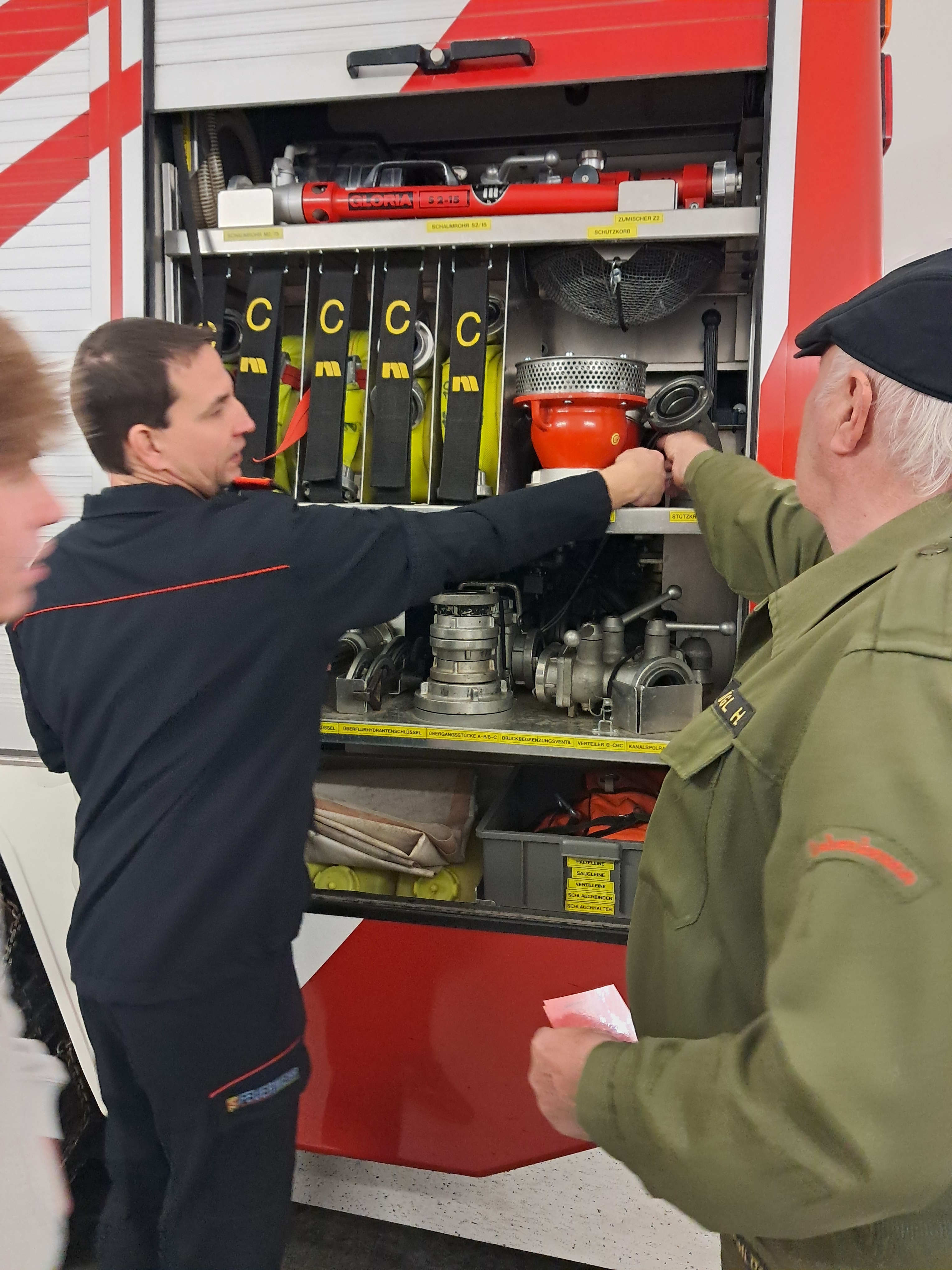 Ein weiterer Schulungspunkt war die Lagerung der Geräte im TLF. Jeder Teilnehmer musste, anhand der gezogenen Gerätekarten, den Lagerort zeigen. Ein sicheres bzw. schnelles Auffinden der Gerätschaften ist für eine erfolgreiche Einsatzbewältigung wichtig. Ausbildungsleiter BI Andreas Schlögl war mit dem Schulungsverlauf sehr zufrieden.