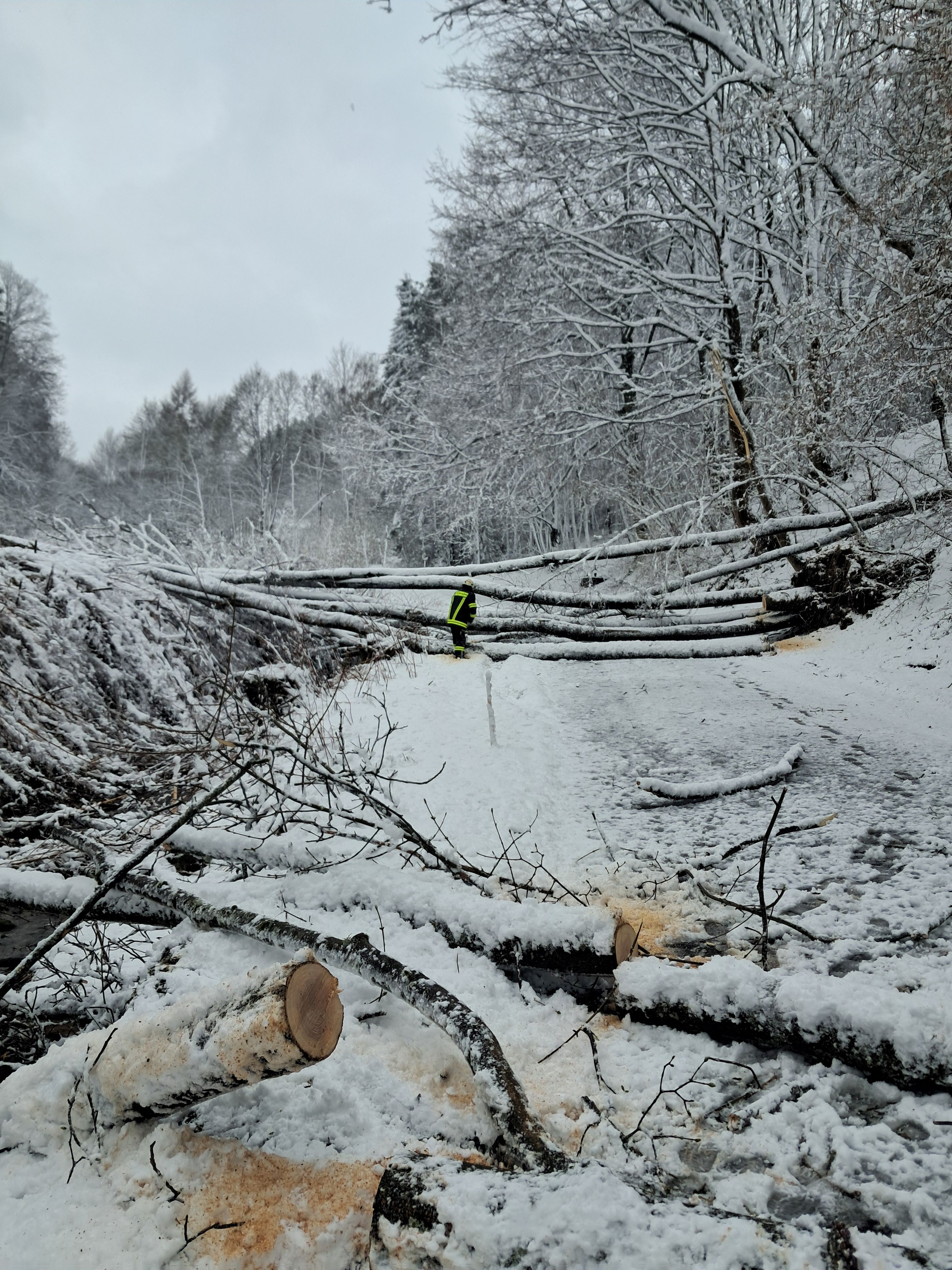 Der Winterdienst der Gemeinde informierte uns, dass der Güterweg Rotleiten | Redlschlag von mehreren umgestürzten Bäumen blockiert ist. Mit Unterstützung des Gemeindetraktors sowie eines priv. Traktors inkl. Rückewagen wurde mit den Aufräumarbeiten begonnen. Aufgrund des stürmischen Windes wurden diese Arbeiten jedoch abgebrochen und wir rückten um ca. 11:15 Uhr ins Feuerwehrhaus ein. Der Güterweg wurde behördlich gesperrt.