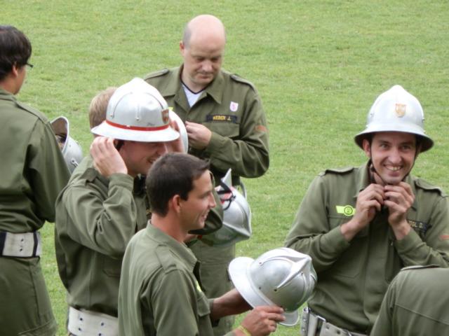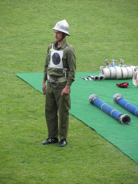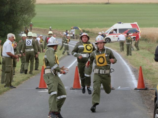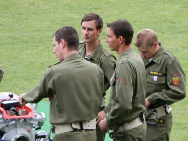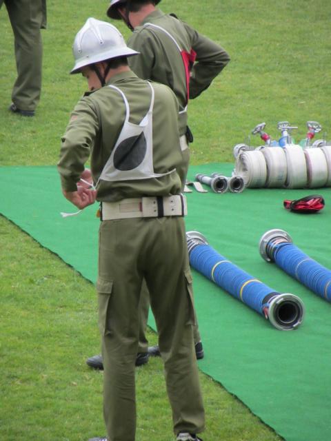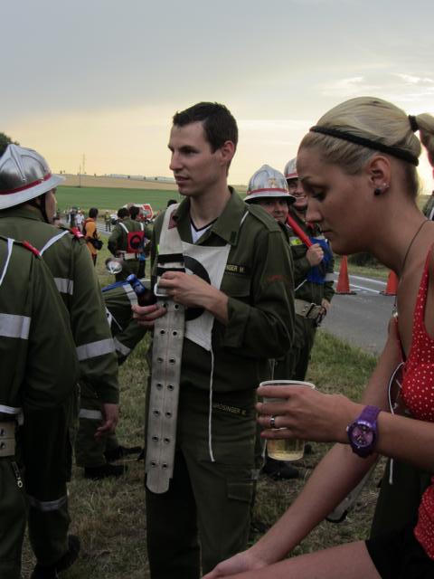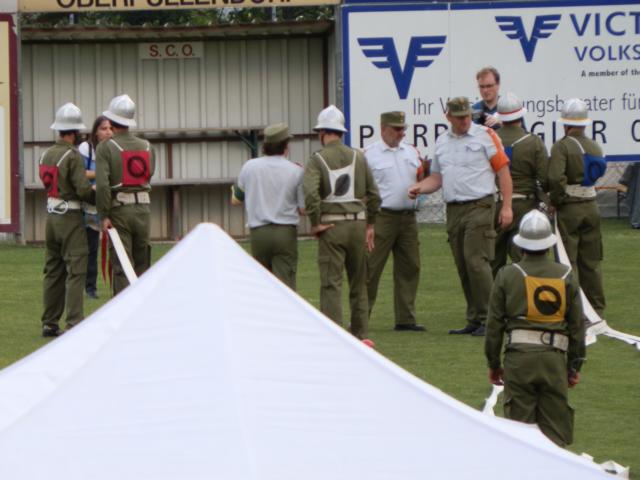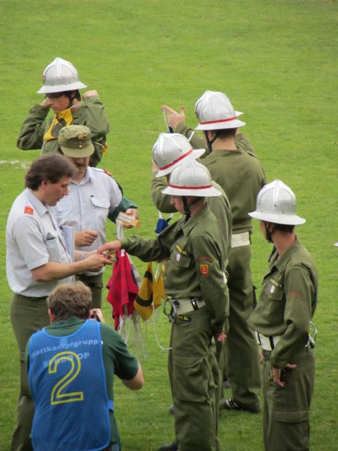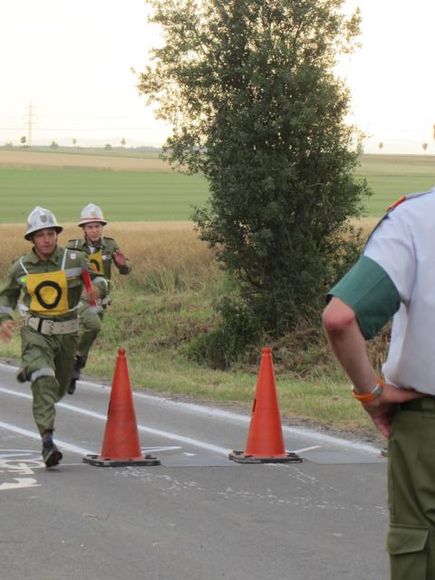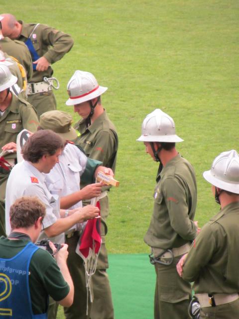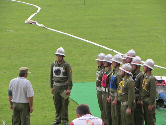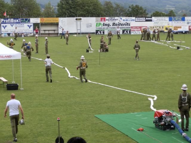 In diesem Sinne begaben wir uns auf die Bewerbsbahn. Konzentriert wurden die Geräte zusammengeräumt und in die richtige Position gebracht. Im nachhinein betrachtet geschah in dieser Phase des Bewerbes ein Fehler, der uns eine Topplatzierung kostete, dazu aber später. Das Kuppeln ging relativ reibungslos von statten - waren doch zwei erfahrene Männer am Werk. Danach nahm das Schicksal seinen Lauf. Der WTM konnte beim Verteiler seinen Schlauchträger nicht öffnen und so musste der WTF nervenzerreibende Sekunden beim Verteiler warten, bis dieses Problem behoben wurde (das Problem wurde bereits wie oben angeführt erkannt, jedoch unzureichend gelöst). Schlussendlich konnte der STF bei 37,69 sec. die Zeit stoppen - gefühlt gingen bei diesem Missgeschick 3 - 4 sec. verloren. Danach folgte die Bewertung und diese ergab erfreuliche 0 Fehlerpunkte. Den anschließenden Staffellauf absolvierten wir bei leichten Nieselregen mit 52,31 sec. Das ergab eine Gesamtpunktezahl von 410,00 - Platz 12 von 108 Gruppen.