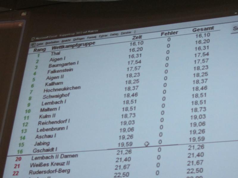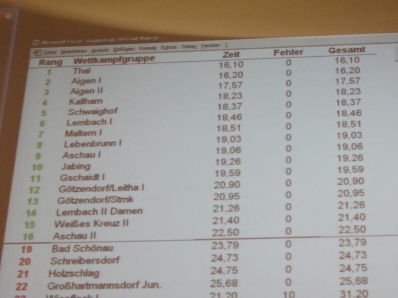 Wenig später war Lebenbrunn II an der Reihe. Das Arbeiten ging sogar besser als bei der 1. Gruppe, doch in Summe wurde wertvolle Zeit liegen gelassen und die Uhr stoppte bei 23,76 sec. fehlerfrei. Im 2. Lauf ging es sogar noch viel besser - kurzfristig schaute es sogar aus, als wäre Lebenbrunn II schneller als die 1er Gruppe. Der WTF stoppte diesen Durchgang bei sehr guten 20,01 sec. - aber leider + 10 Fehlerpunkte. Persönliche Anmerkung: es wäre eine Zeit von 18 - 19 sec. drinnen gewesen. In der Endwertung belegte Lebenbrunn II den 25. Platz.