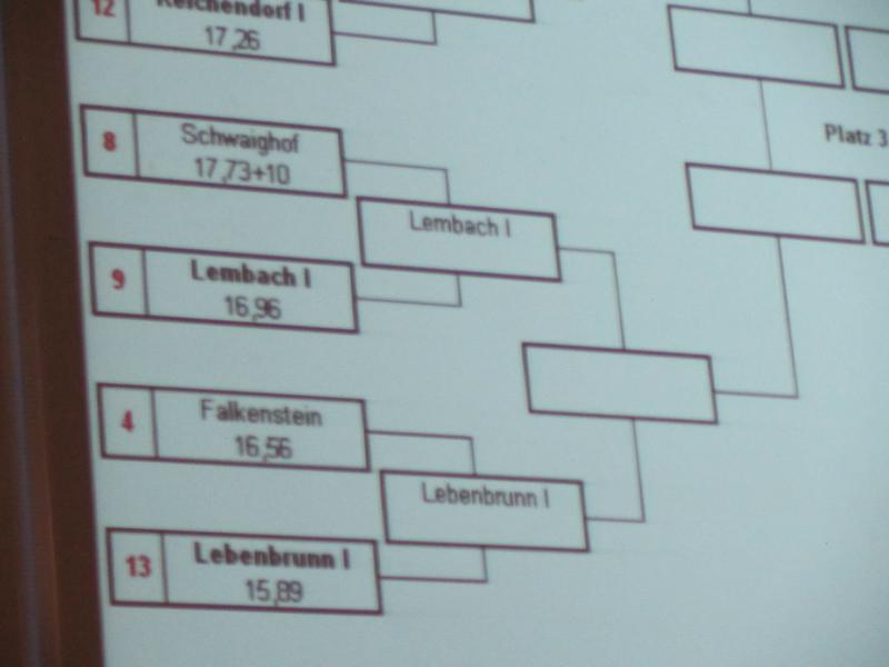 Top 8: Hier trafen wir auf unsere guten Freunde aus Lembach. Das Arbeiten beider Gruppen ging quasi synchron von statten - die Zeiten: Lebenbrunn I - 15,92 sec. Lembach - 15,67 sec. Somit war für uns hier Schluss - Endplatzierung: 5. Platz