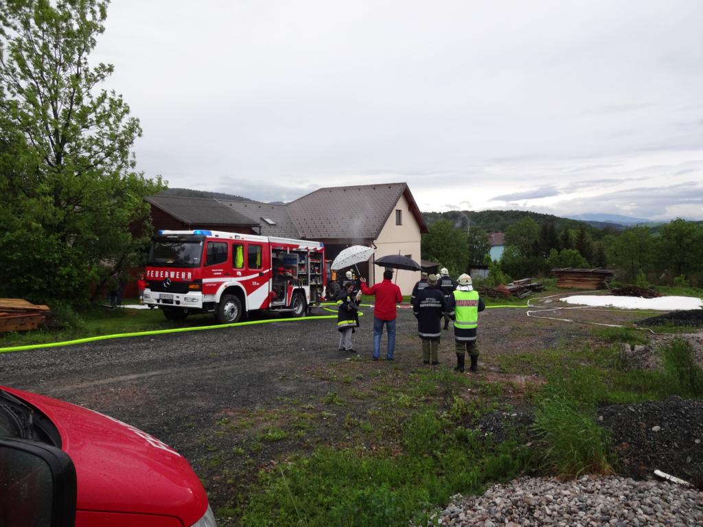 Nach dem Eintreffen der OF Steinbach erhielten diese von der EL die entsprechenden Befehle. Die TLF-Besatzung führte einen Außenangriff (hofseitig) durch. Die Wasserversorgung wurde durch eine Zubringerleitung (Hydrant Haus-Nr. 11) sichergestellt. Weiters rüstete sich ein ATS-Trupp aus, der unseren Trupp ablöste. Die Besatzung des KLF hatte ebenfalls einen Außenangriff durchzuführen. Es galt das Übergreifen der Flammen auf das Nachbargebäude zu verhindern. Als Wasserentnahmestelle diente der Hydrant bei Haus-Nr. 35. Die OF Steinbach war mit 18 Mann im Einsatz. Beide ATS-Trupps führten noch eine gemeinsame Traktorbergung durch.