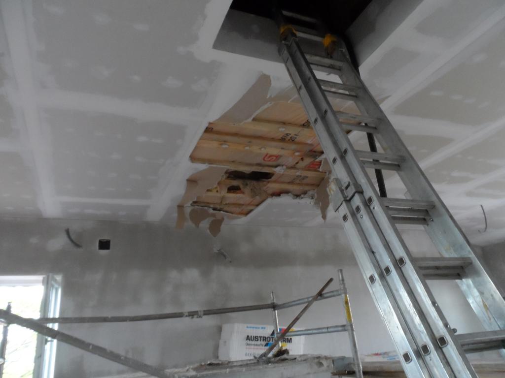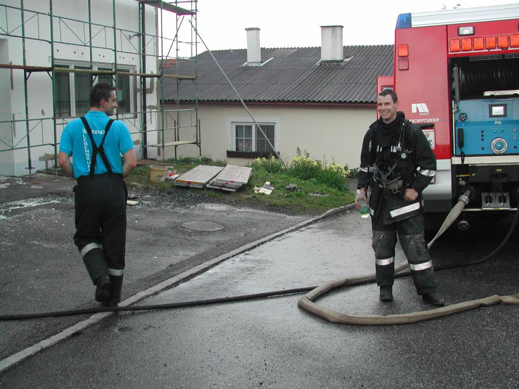 Mitglieder der Jugend Lebenbrunn (großteils auch Feuerwehrmitglieder) waren mitten in den Vorbereitungsarbeiten für den Maibaumumschnitt. Da man von der Veranstaltungshalle aus einen guten Blick über die Ortschaft hat erkannten sie, dass im Bereich des Feuerwehrhauses Rauch aufsteigt und eilten daher unverzüglich dorthin. Unterstützt durch anwesende Kameraden, die bis zum Gewitterausbruch mit Fassadenarbeiten beschäftigt waren, wurden erste Erkundungsmaßnahmen im Feuerwehrhaus eingeleitet. Schnell wurde der Brandherd entdeckt und ein ATS-Trupp begann mit dem Erstangriff. Gleichzeitig wurde die Ausrückmeldung (16:02 Uhr) an die LSZ Burgenland abgesetzt. Von dieser wurde auch die OF Steinbach als Unterstützung bzw. ATS-Reserve nachalarmiert. Der Blitz schlug beim Dachständer des Feuerwehrhauses ein und setzte die hölzerne Befestigungssäule des Ständers in Brand. Der Brand breitete sich in geringem Ausmaß über die Decke aus. Daher mussten sowohl Brettverschalung und die Rigipsverkleidung teilweise geöffnet und das Dämmmaterial entfernt werden. Aufgrund der Anforderung einer Wärmebildkamera wurde die Stadtfeuerwehr Pinkafeld durch die LSZ alarmiert. Nach der Kontrolle mittels Kamera konnte um 17:30 Uhr „Brand aus“ gegeben werden. Die Einrückmeldung erfolgt im 17:45 Uhr. 2 Mann unserer Wehr unterstützten in weiterer Folge noch den Techniker der Energie Burgenland. Das Feuerwehrhaus musste komplett vom Stromnetz genommen werden. Am Montag erfolgt die Schadenserhebung durch die Versicherung und die Instandsetzung der Stromversorgung durch ein konzessioniertes Elektrounternehmen.